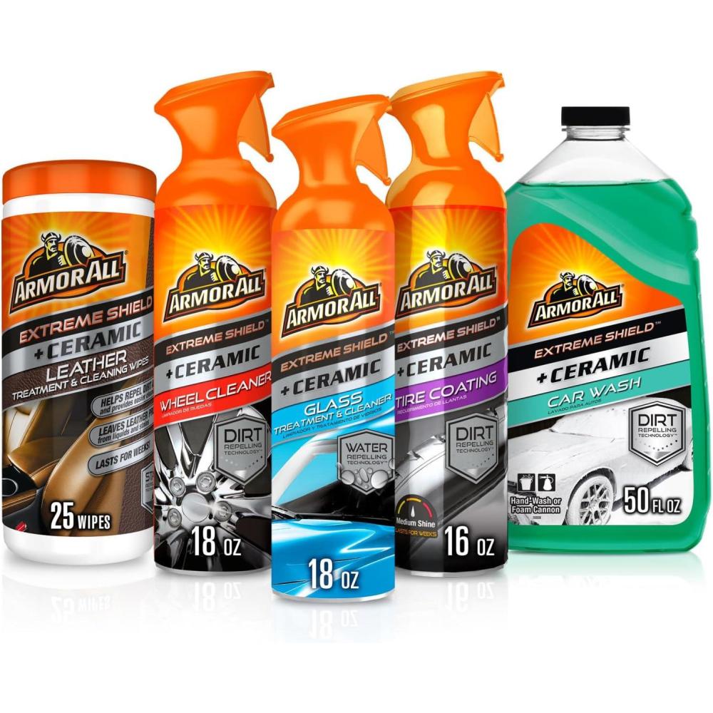 [Exterior Car Care Kit]: 5-piece Armor All Complete Ceramic Exterior Car Cleaner Includes Tire Coating Spray, Wheel Cleaner, Car Wash, Glass Cleaner and Leather Cleaning Wipes