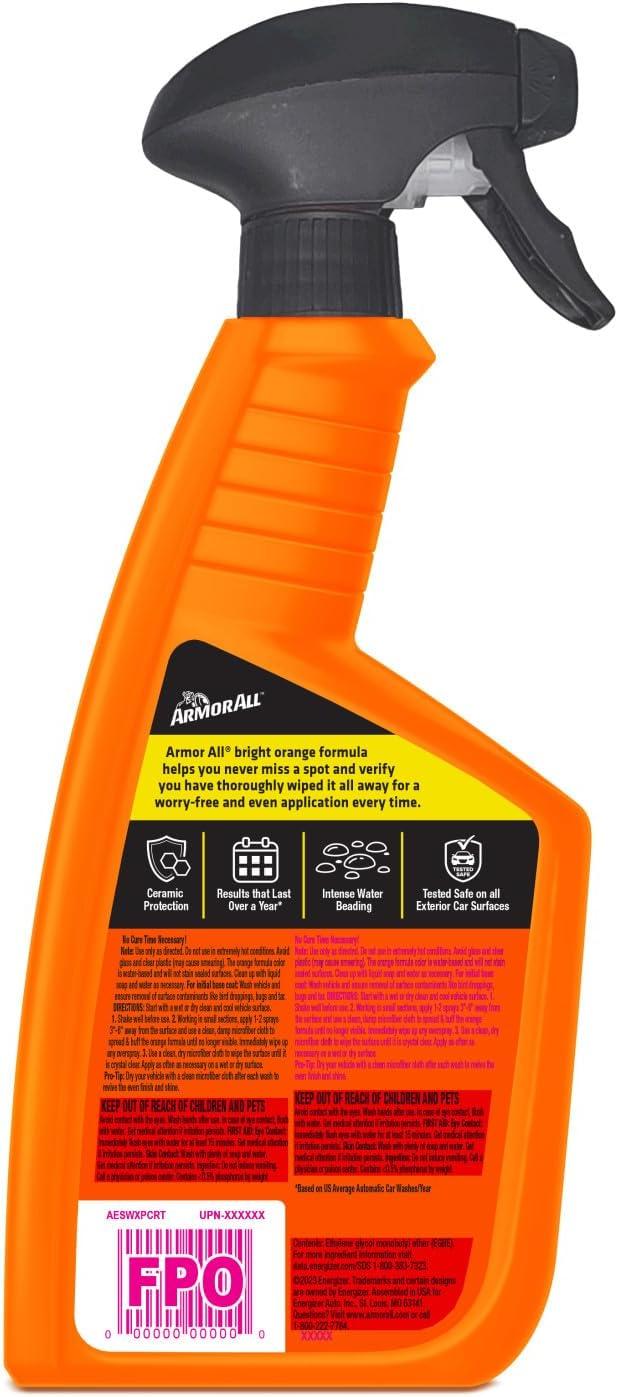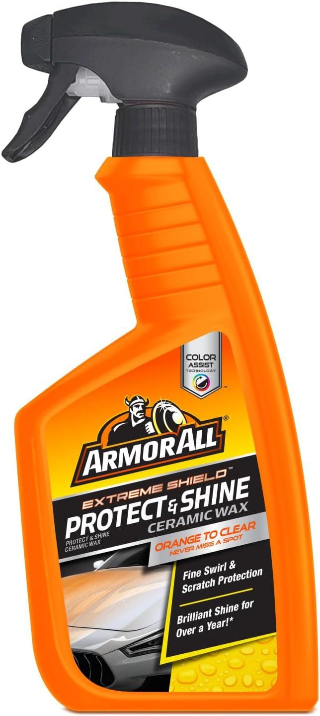 Enhance your car's shine and help protect against fine swirls and scratches with Armor All Extreme Shield Protect & Shine Ceramic Wax. This ceramic car wax spray features innovative ceramic technology and our proprietary combination of synthetic and natural carnauba waxes, providing a brilliant shine that lasts over a year.* Made with our unique Color Assist Technology, the easy-to-use liquid wax sprays on orange and wipes away crystal clear to help ensure you never miss a spot. Armor All Extreme Shield Protect & Shine Ceramic Spray Wax for Cars provides long-lasting paint protection, rich color depth and extreme water beading, and it's safe for use on all exterior auto surfaces. Help keep your car looking and feeling like new with Armor All, a trusted name in car care products. (*Based on U.S. average automatic car washes per year).