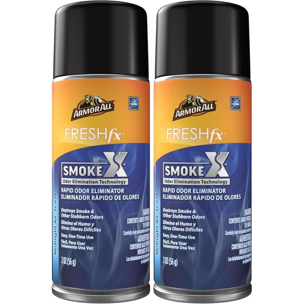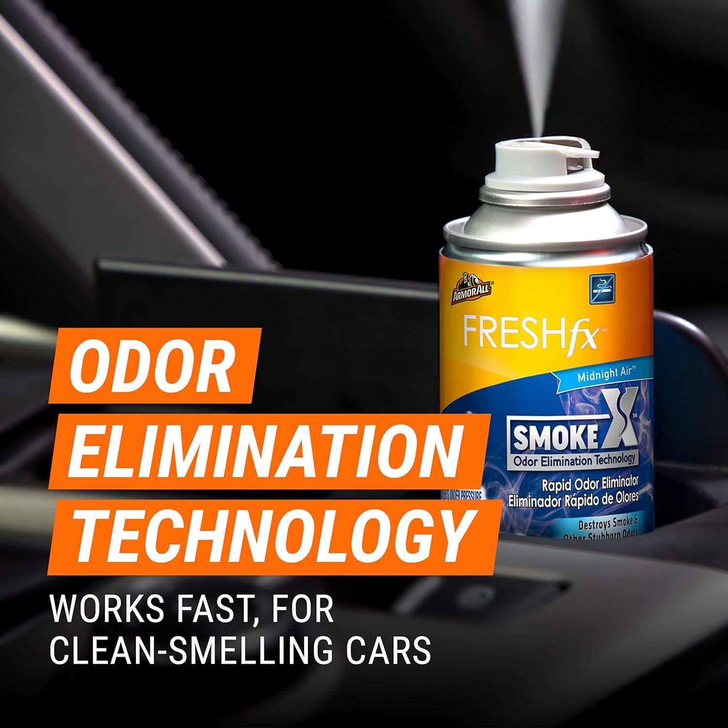 Armor All FRESH fix Smoke X Rapid Odor Eliminator in Midnight Air Scent features Smoke X patented Odor Elimination Technology that destroys smoke and other stubborn odors. Odors are destroyed leaving behind a refreshing Midnight Air fragrance that carries notes of lemon verbena, leather, patchouli and warm woods like a mystic breeze.
