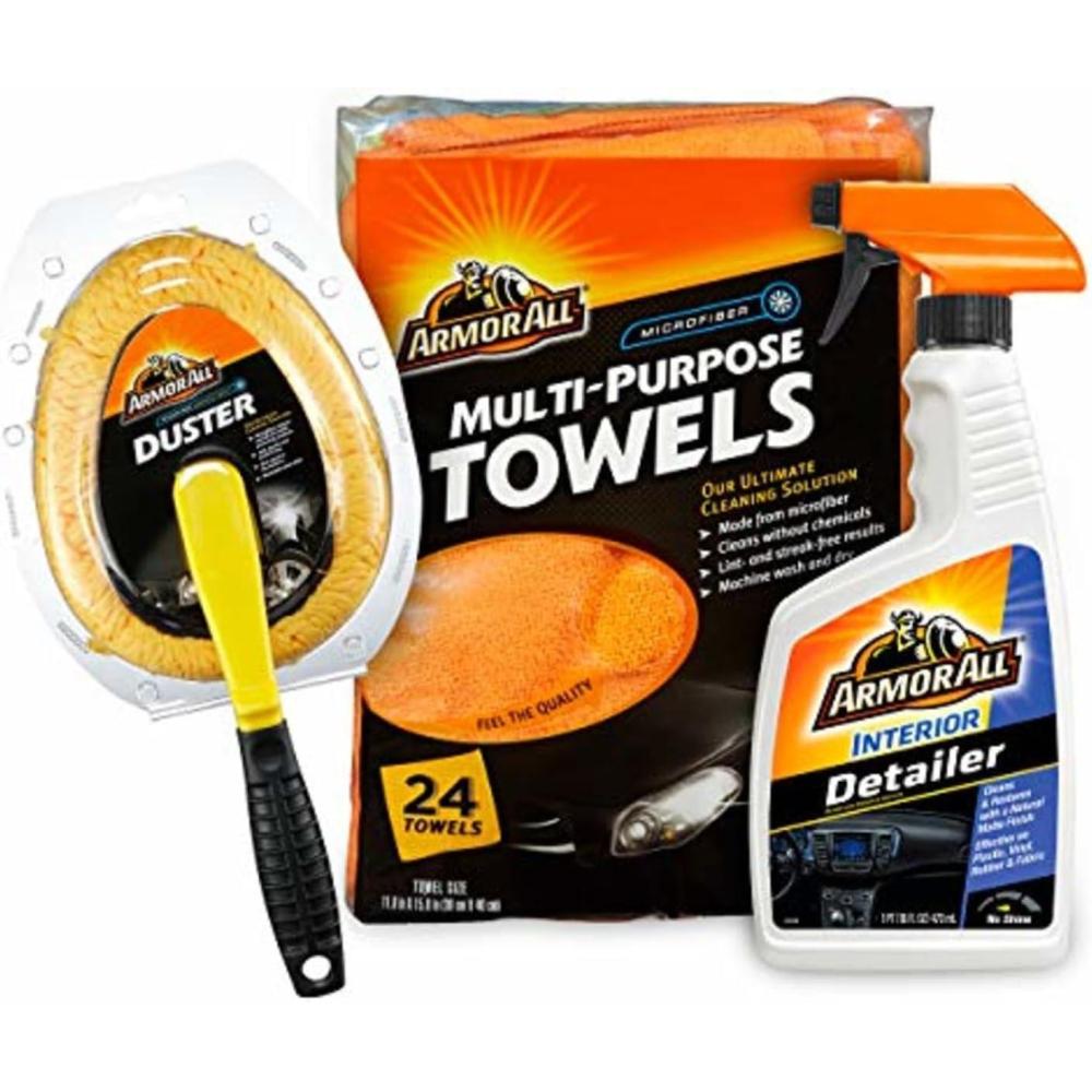 Grab the Armor All Car Interior Cleaner Bundle to help keep your car's interior looking like new. This auto detailer bundle includes microfiber towels, an interior duster and Armor All Interior Detailer Spray. Scientifically engineered to restore and reveal the natural appearance of vehicle surfaces, this interior detailer spray is a multi-surface cleaner with a non-greasy, residue-free formula. Spray it on any interior car surface and wipe using a soft cloth. Pair this interior car cleaner with an Armor All Microfiber Towel for lint and streak-free results. These multi purpose towels are machine washable for easy care. Crafted with microfibers, the Armor All Car Duster lifts dirt off dry surfaces with a soft, gentle dusting surface that's scratch free. When it gets dirty, remove the end from the handle and wash it by hand or in the washing machine. Keep this car care kit handy to freshen up your vehicle interior at home.