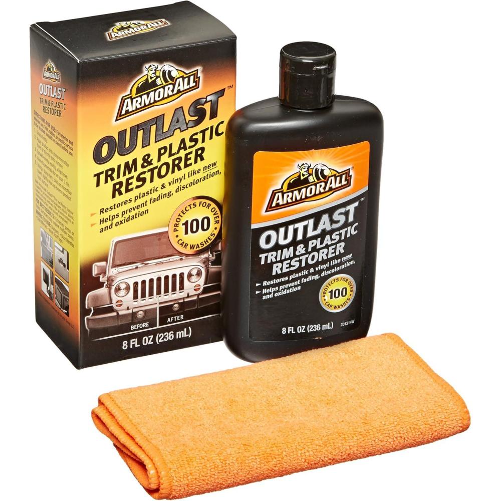 Over time, exterior trim, plastic, and rubber surfaces can become dull or discolored, caused by wear, weather, and the sun’s UV rays. Armor All Outlast Trim & Plastic Restorer can rejuvenate these worn and weathered surfaces to help them look like new again.