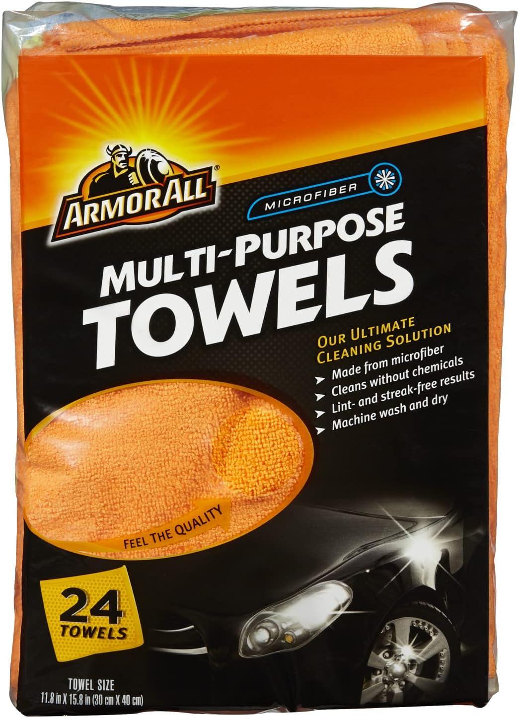 This Armor All Microfiber Cleaning Cloth 24 Pack features 8 orange, 8 blue, and 8 yellow super soft microfiber towels built for all your auto care and home needs. These towels are built to last with highly absorbent microfibers that can be used wet or dry on a variety of surfaces. These premium 80% Polyester and 20% Polyamide microfibers safely clean surfaces by wedging dirt and moisture in between fibers ' unlike conventional fibers that just push dirt and moisture around. This helps provide a lint free and streak-free shine. These microfiber towels are also gentle enough to be used on more delicate vehicle interior surfaces like dashboards and leather seats. Save money over conventional paper towels by using our durable and machine washable towels. Whether you need a cleaning cloth for multipurpose cleaning or a microfiber towel to deliver a showroom shine, choose this Armor All Microfiber Cleaning Cloth 24 Pack. Our complete range of high-quality car care products is specially designed to make it faster and easier for you to keep your car looking in showroom condition – both inside and out.